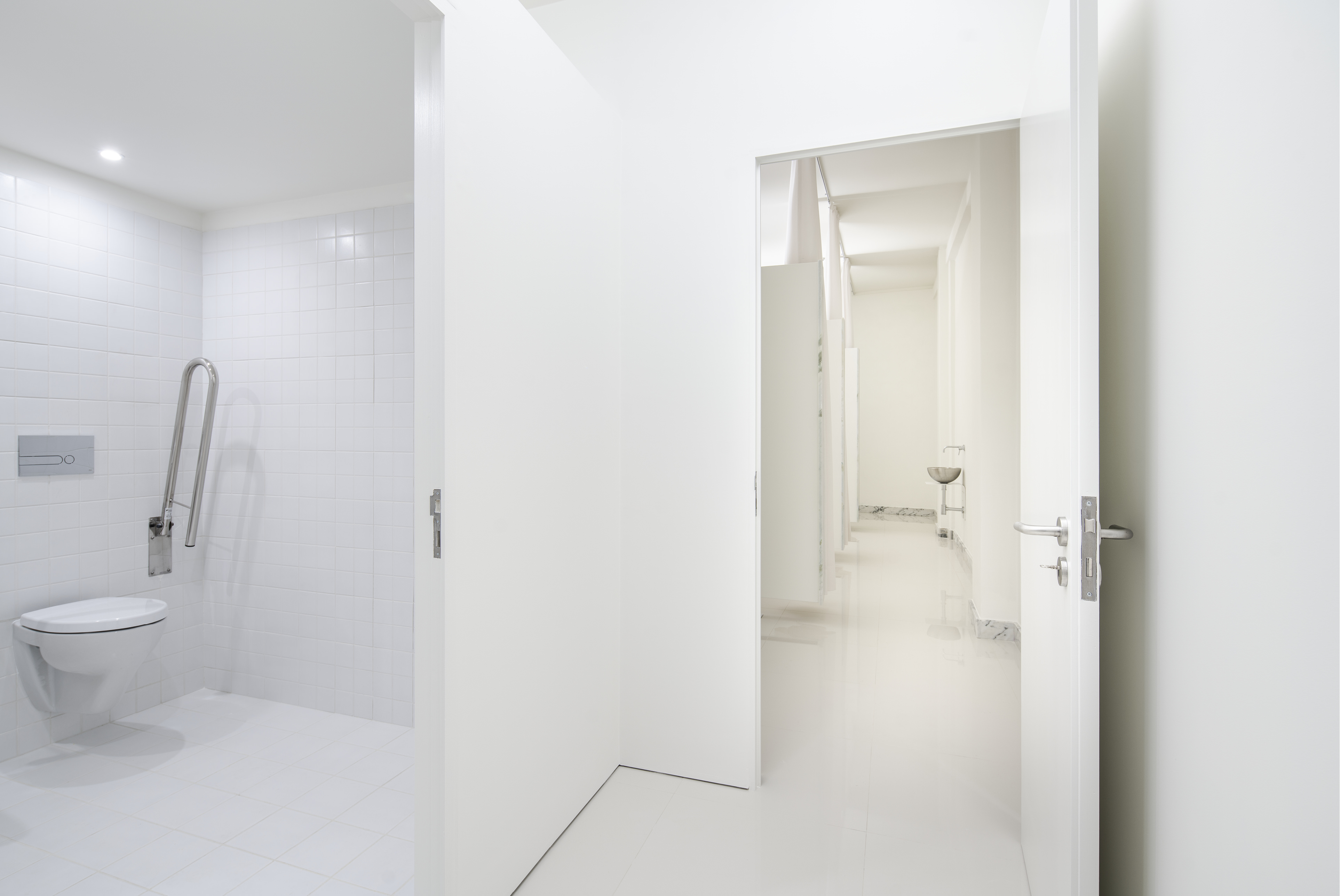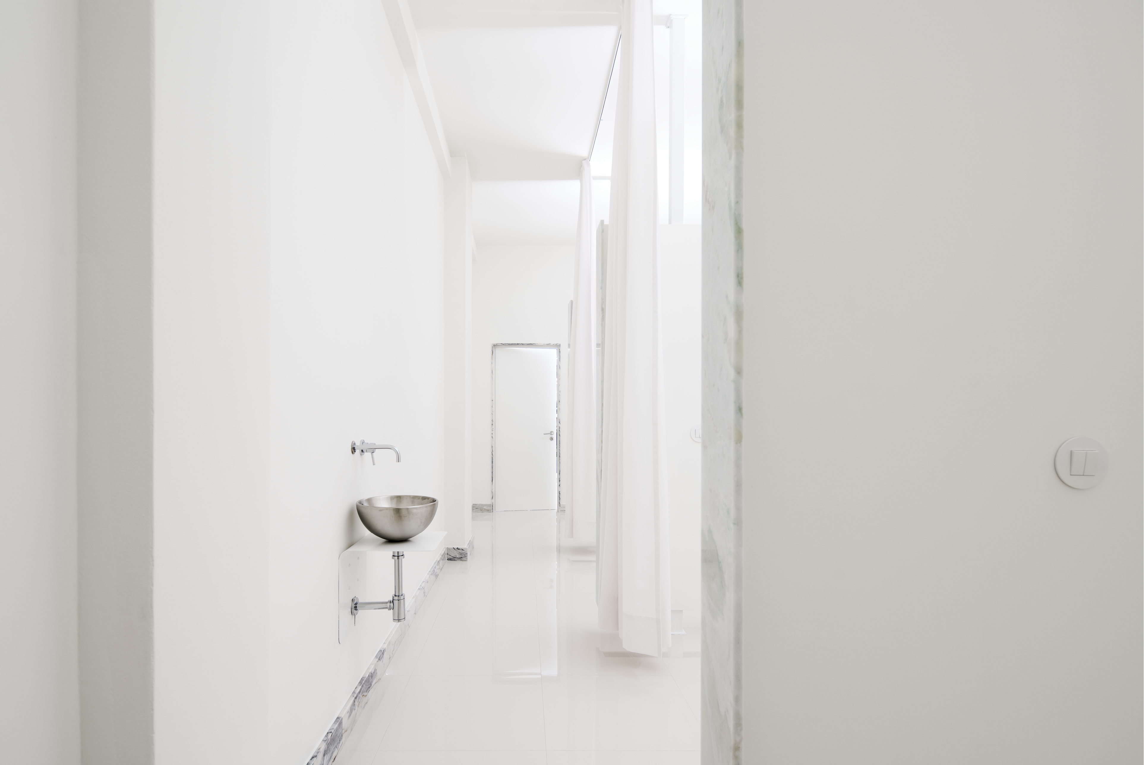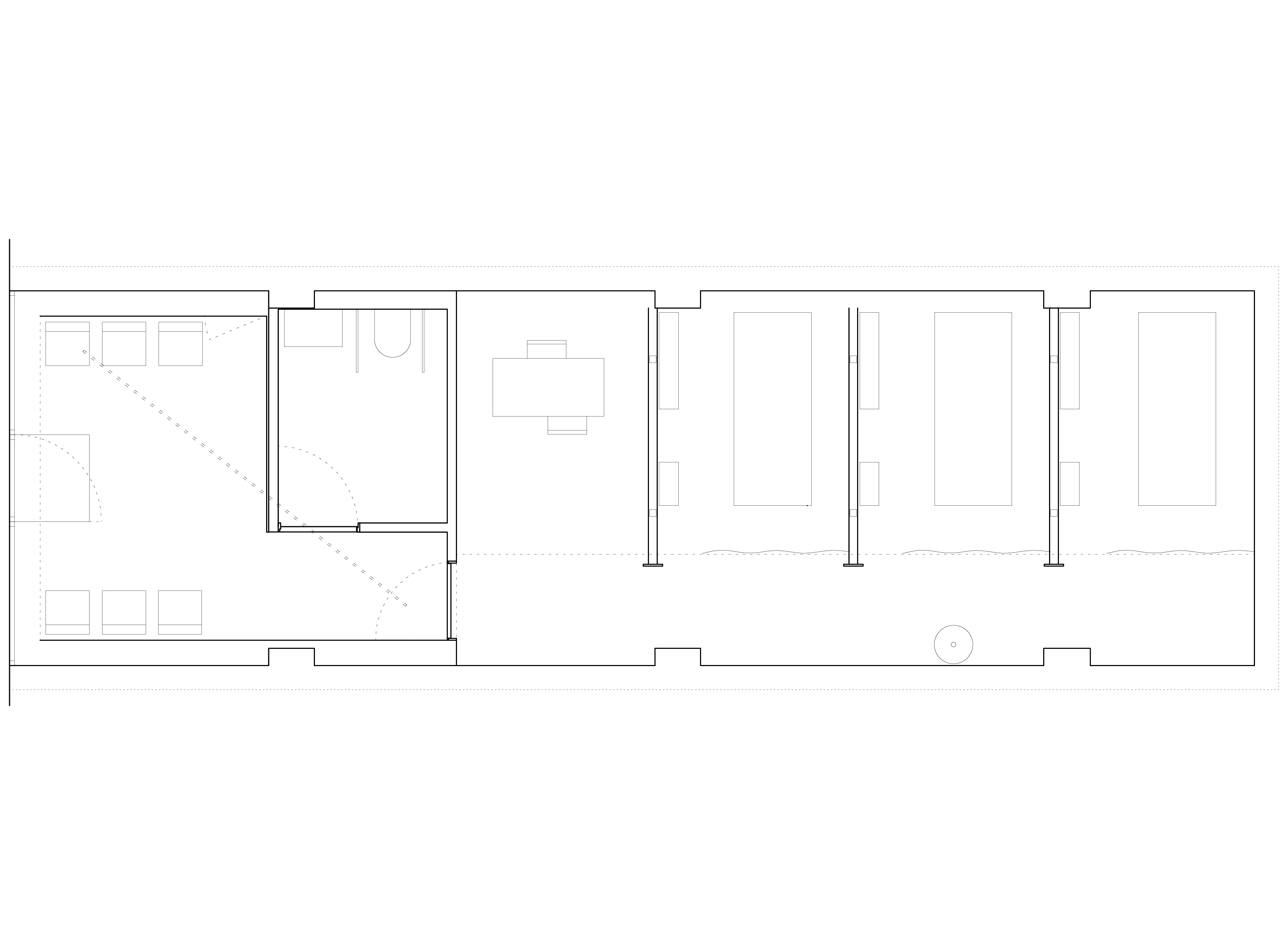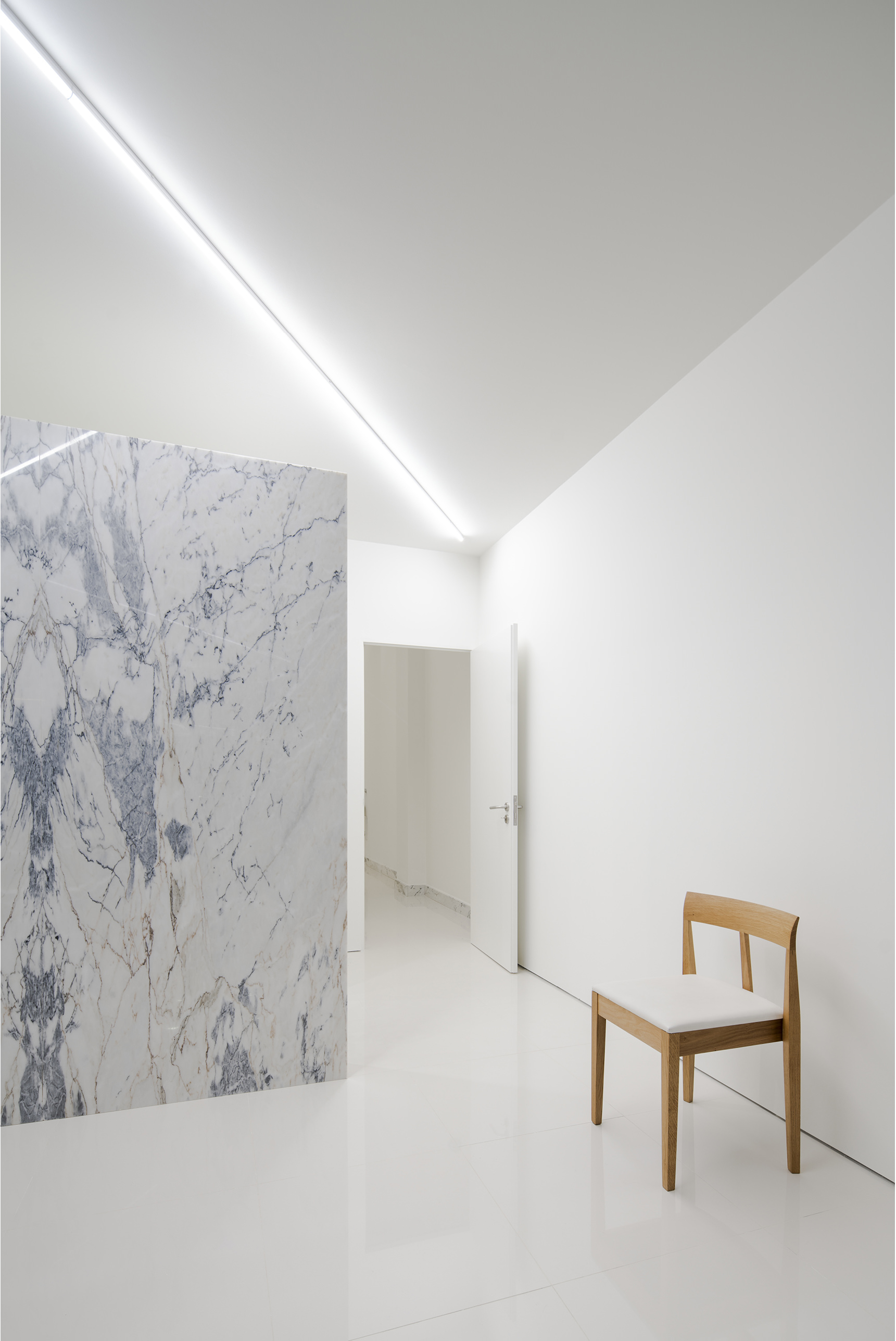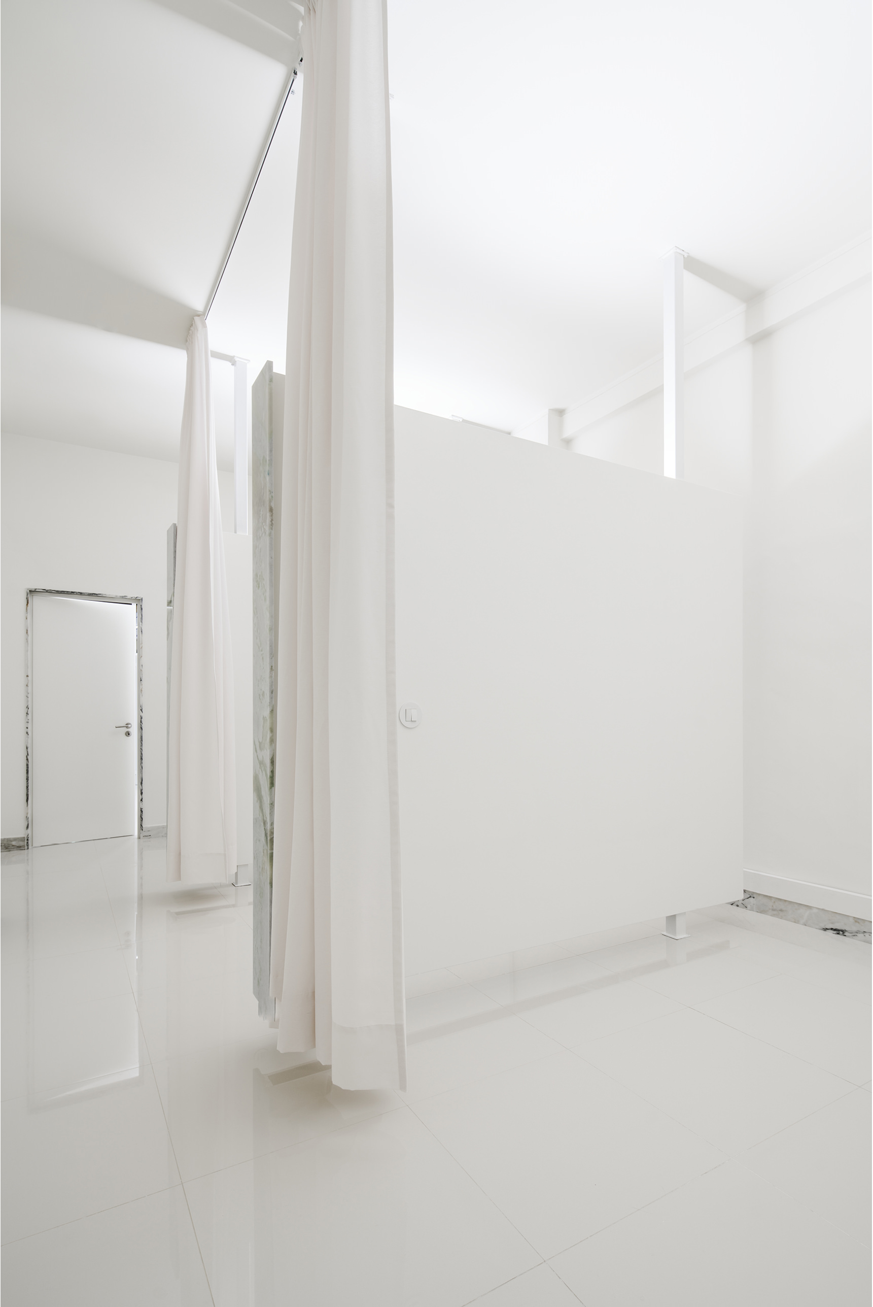 The reception proposes a "box inside a box" showing the original and infrastructural perimeter of the store, drawing a scenic space stripped of any signs. This strategy solves the minimal use of the building features and launches the entire interior atmosphere that was only painted and added a skirting on top of the new pavement. The subdivision of the work cabins are constituted by planes that float in space allowing a dynamic use by the therapist creating a unique atmosphere of treatment.