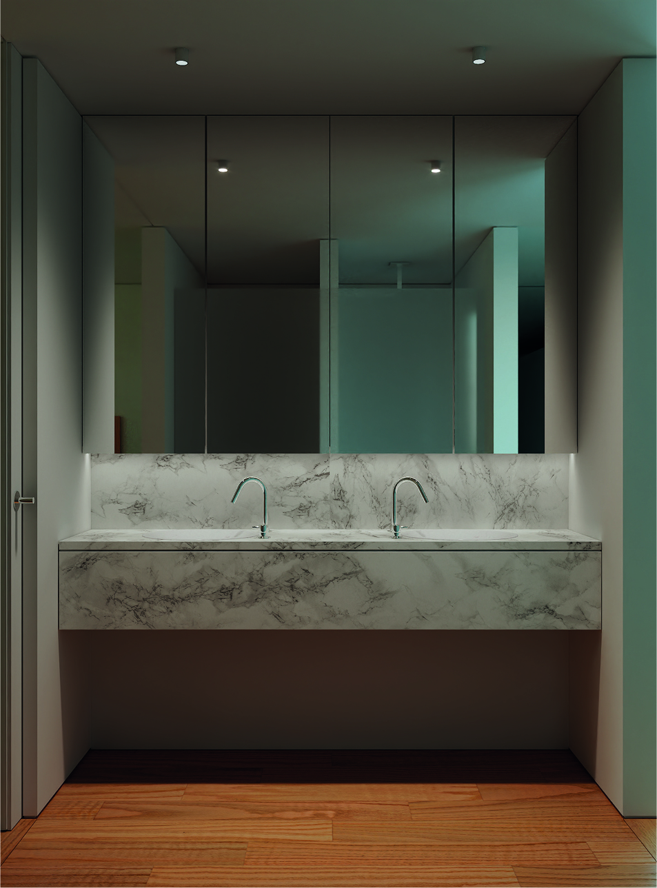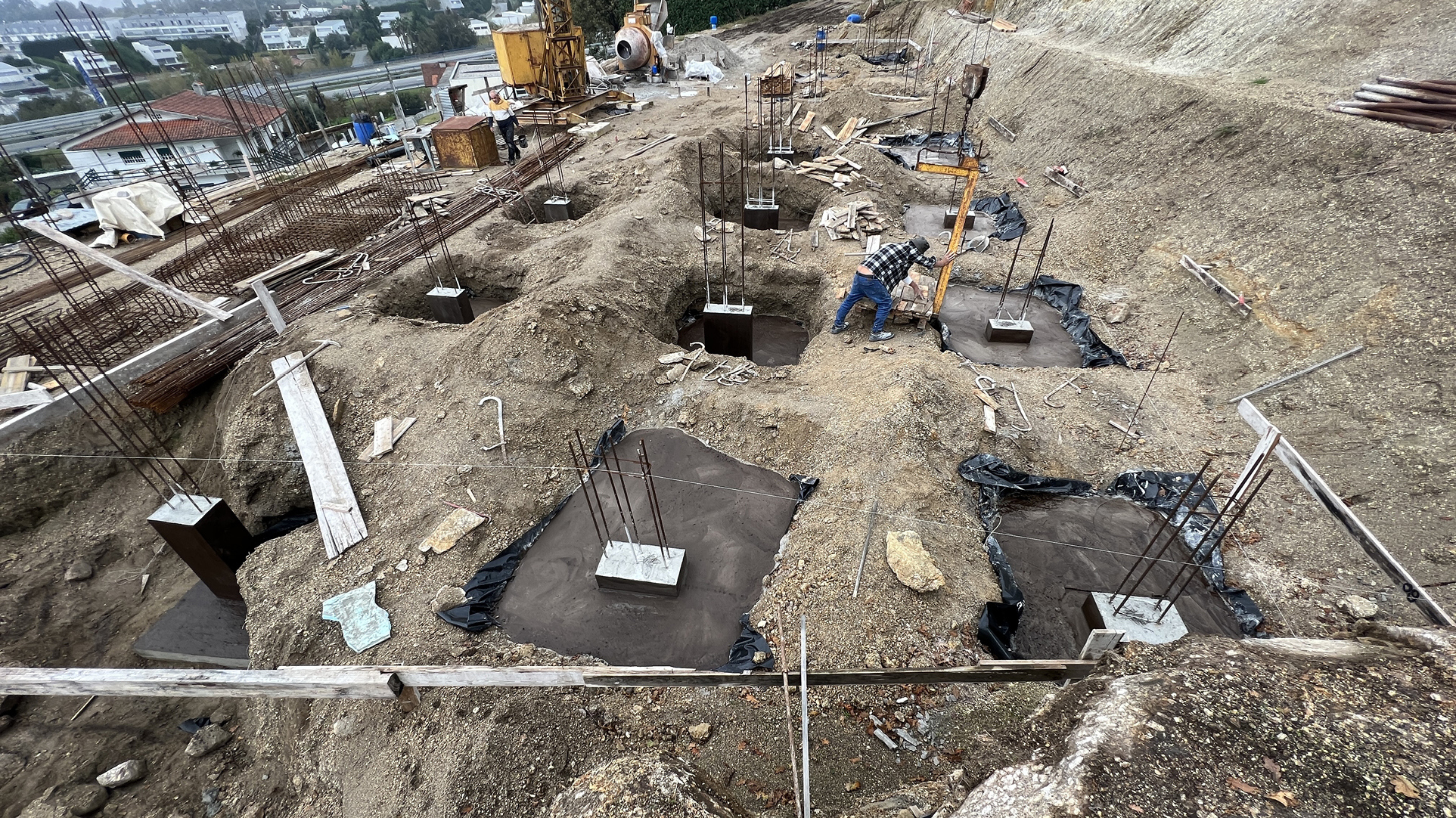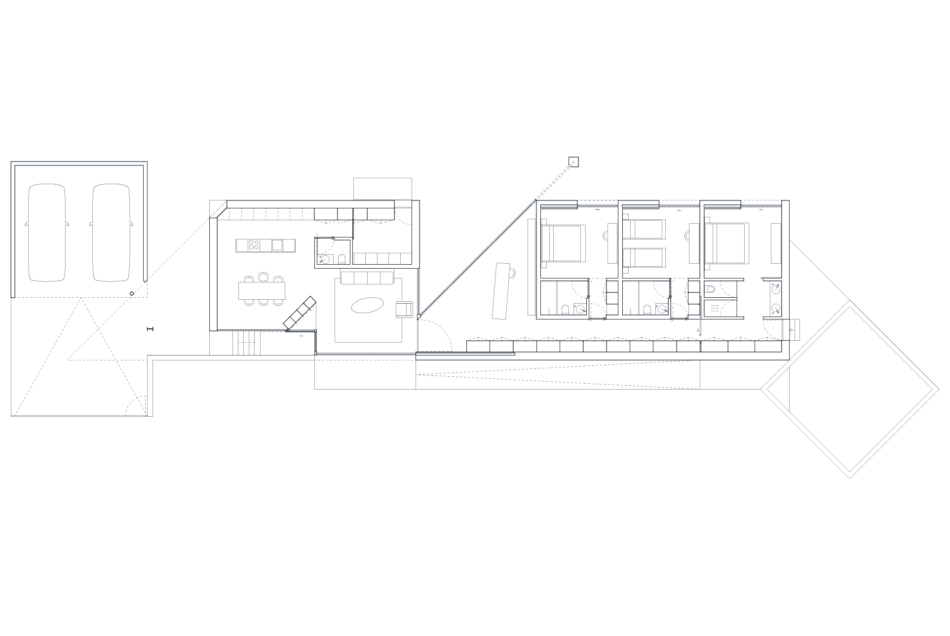 The construction site had a lot of municipal constraints besides an 8m differential from the high to the low level and being a highly rocky ground. The most structural design constraint was the definition of a different percentage of construction for each half of the land. The shape and position of the volume, for the minimum intended construction area, it was just an arithmetic game. The building base that touches the ground was the one that had to fit the percentages and, at some point, it was necessary to reduce the area. The module that divided the social area from the private area of the house seemed to be the right module to remove half of it, diagonally. Therefore, a 45º angle was defined which became the rule, whether for positioning the pool or defining the roof geometry that makes the connecting between the garage into the house.