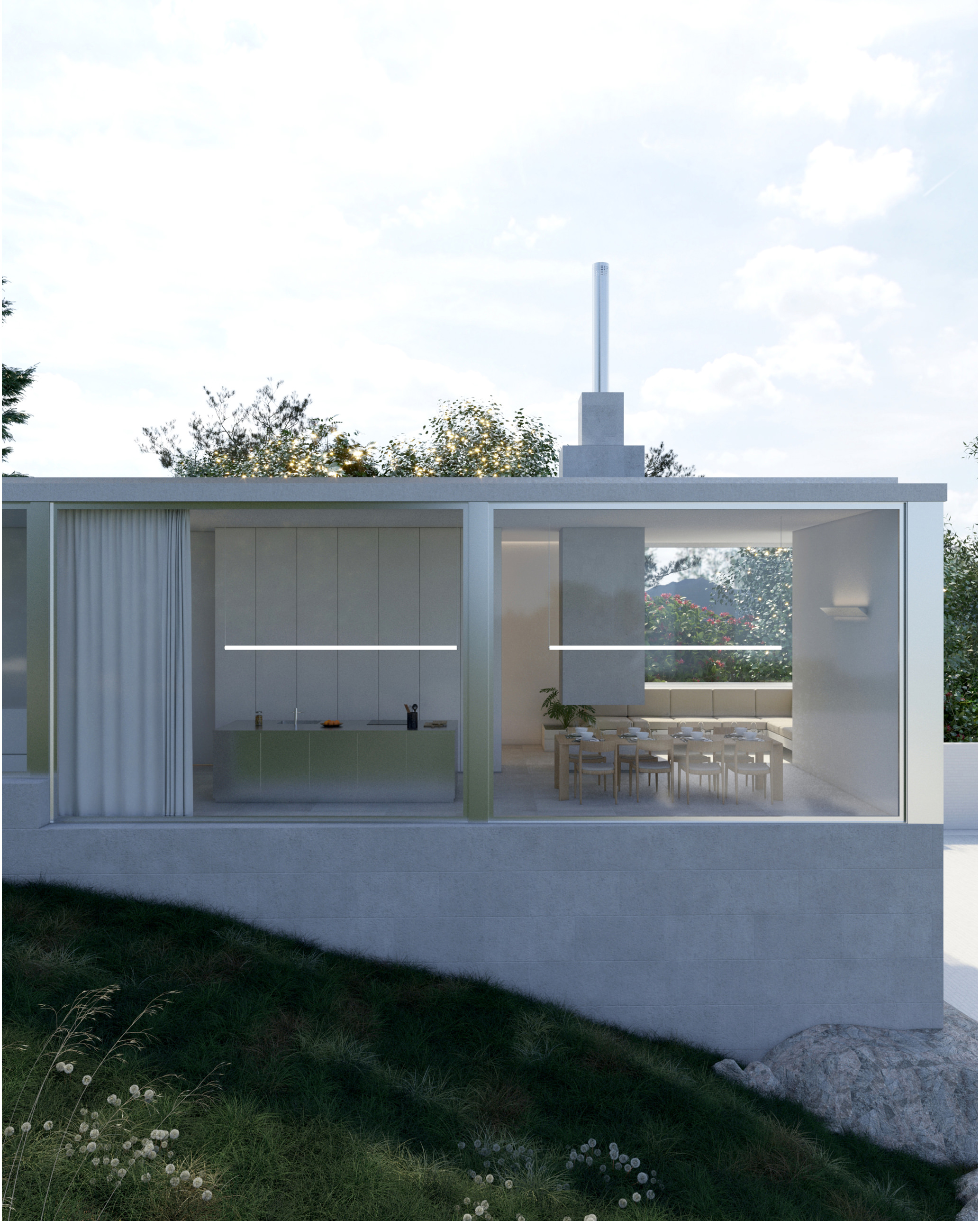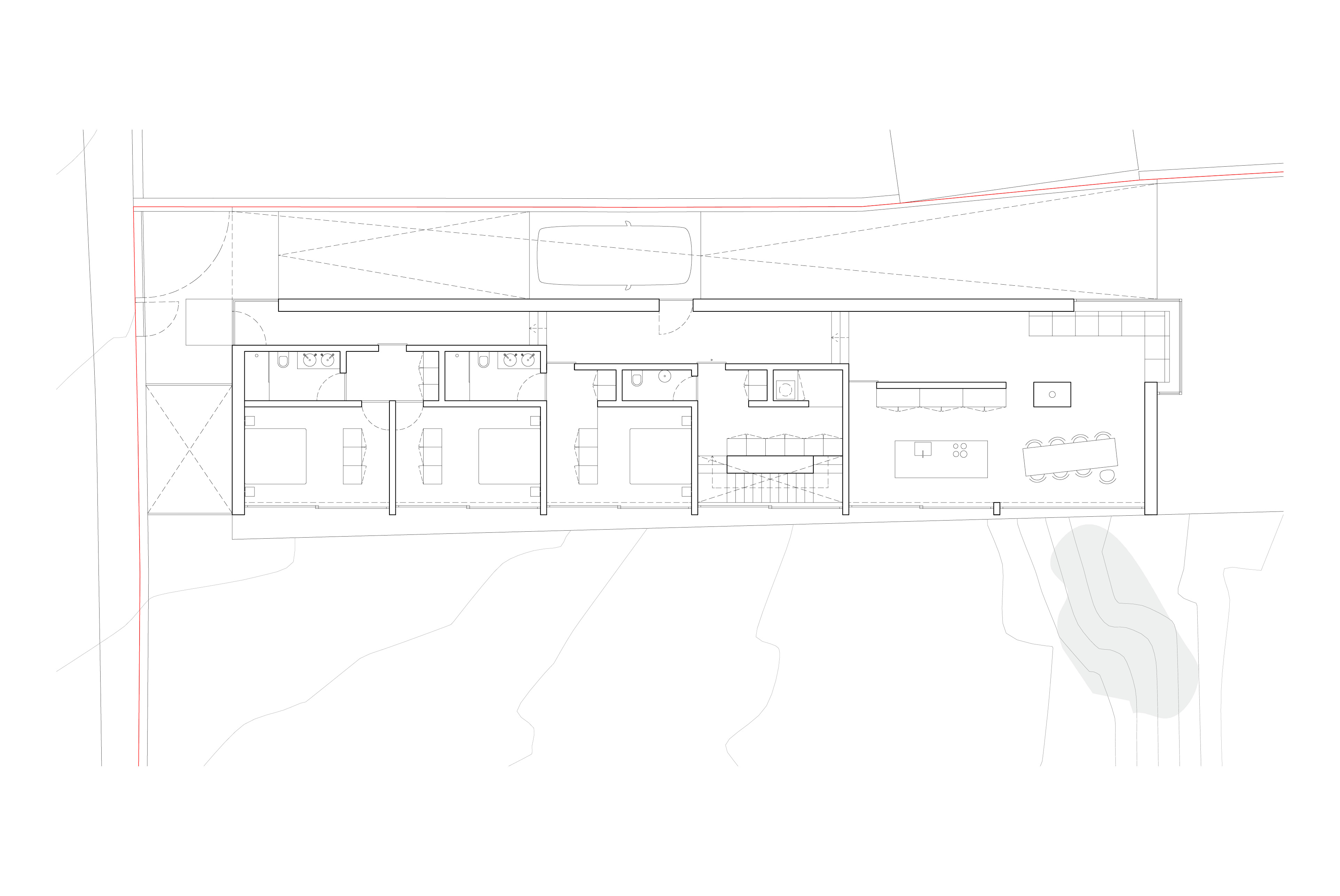We knew that the typology would be linear and due to the proximity of the neighbor to the South, we blinded this facade. To the North, the facade opens up to it's full length over 2300sqm terrain where nothing could be built. A internal corridor starts to be defined as a longitudinal link over the total extension of the house and we felt it was important to work on this "unloved typology piece". More than an access, we started to deconstruct the corridor in it's width and height, following the natural unevenness of the terrain; plus the natural internal program sequence.