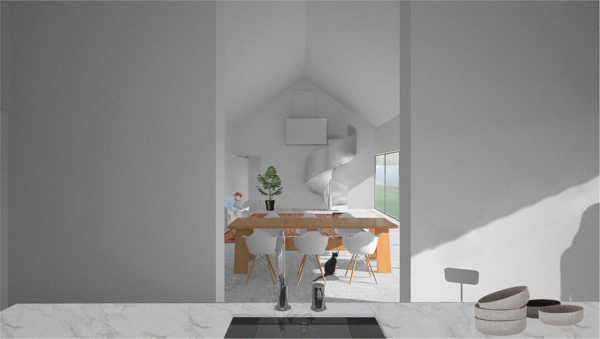 Through a modular structural grid the several uses are disposed over the glass panel that opens onto the garden to North. The different heights of the ceiling, the tree disposal and the body of water - and it’s relations - allows different atmospheres as one goes deeper into the house.