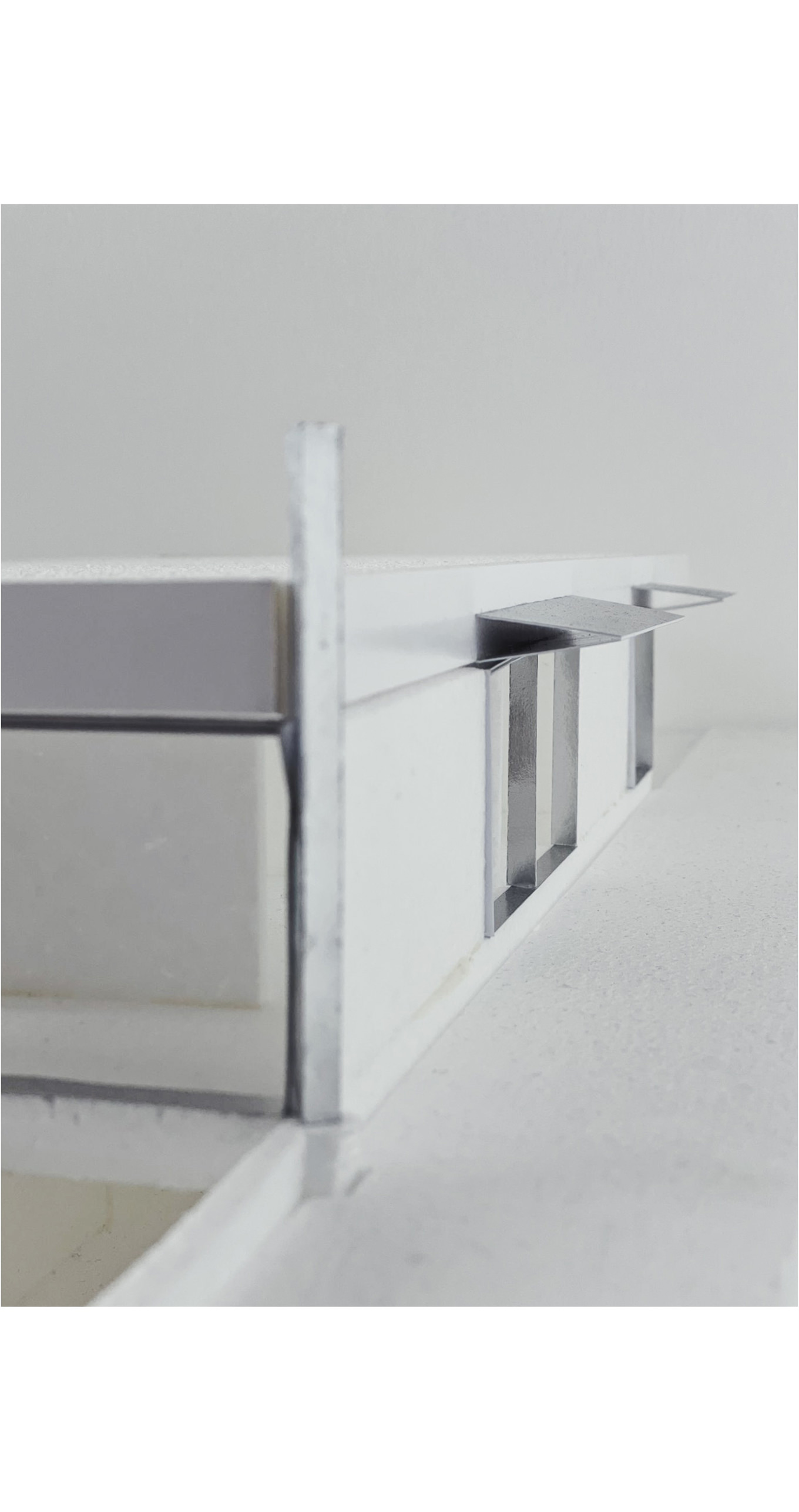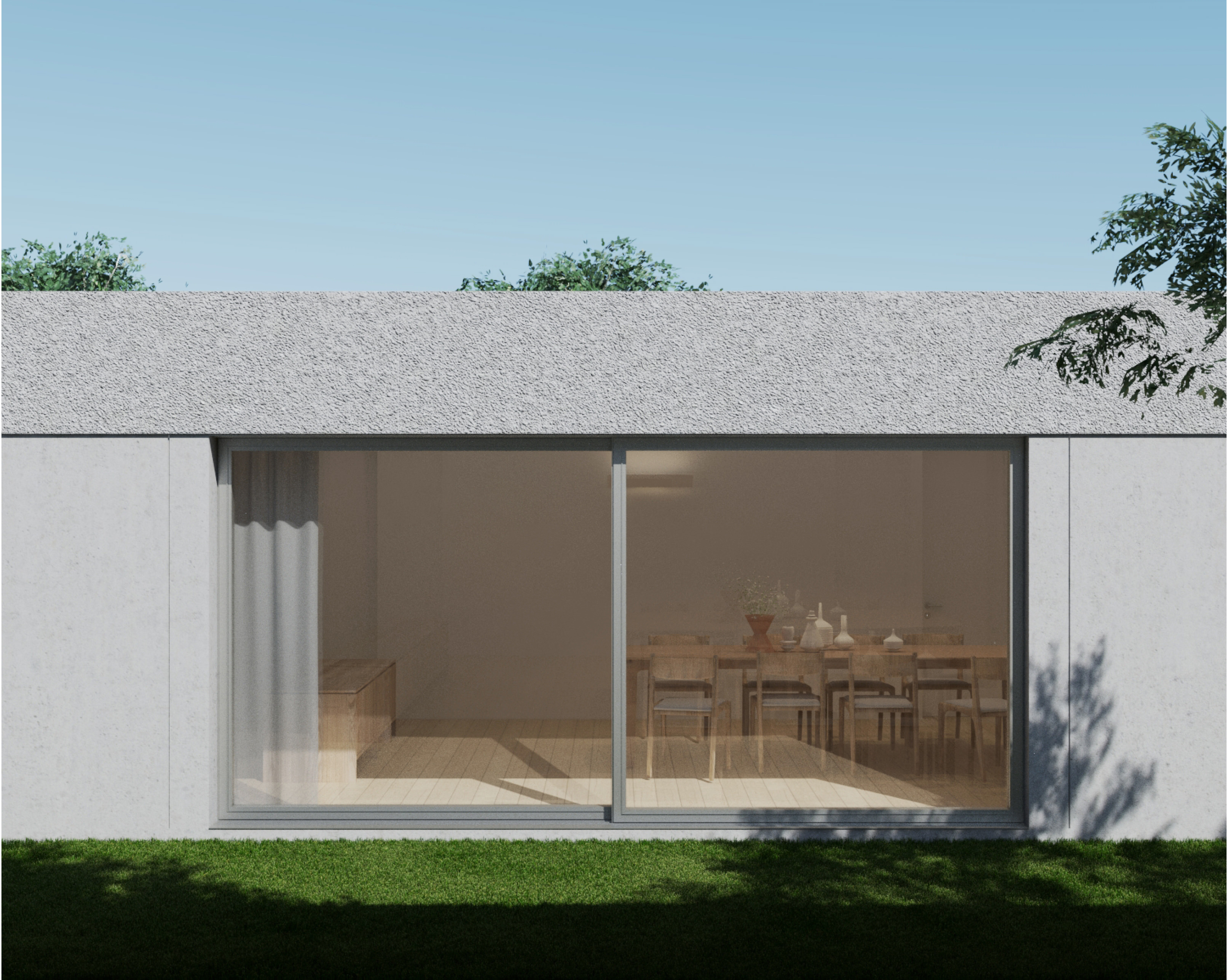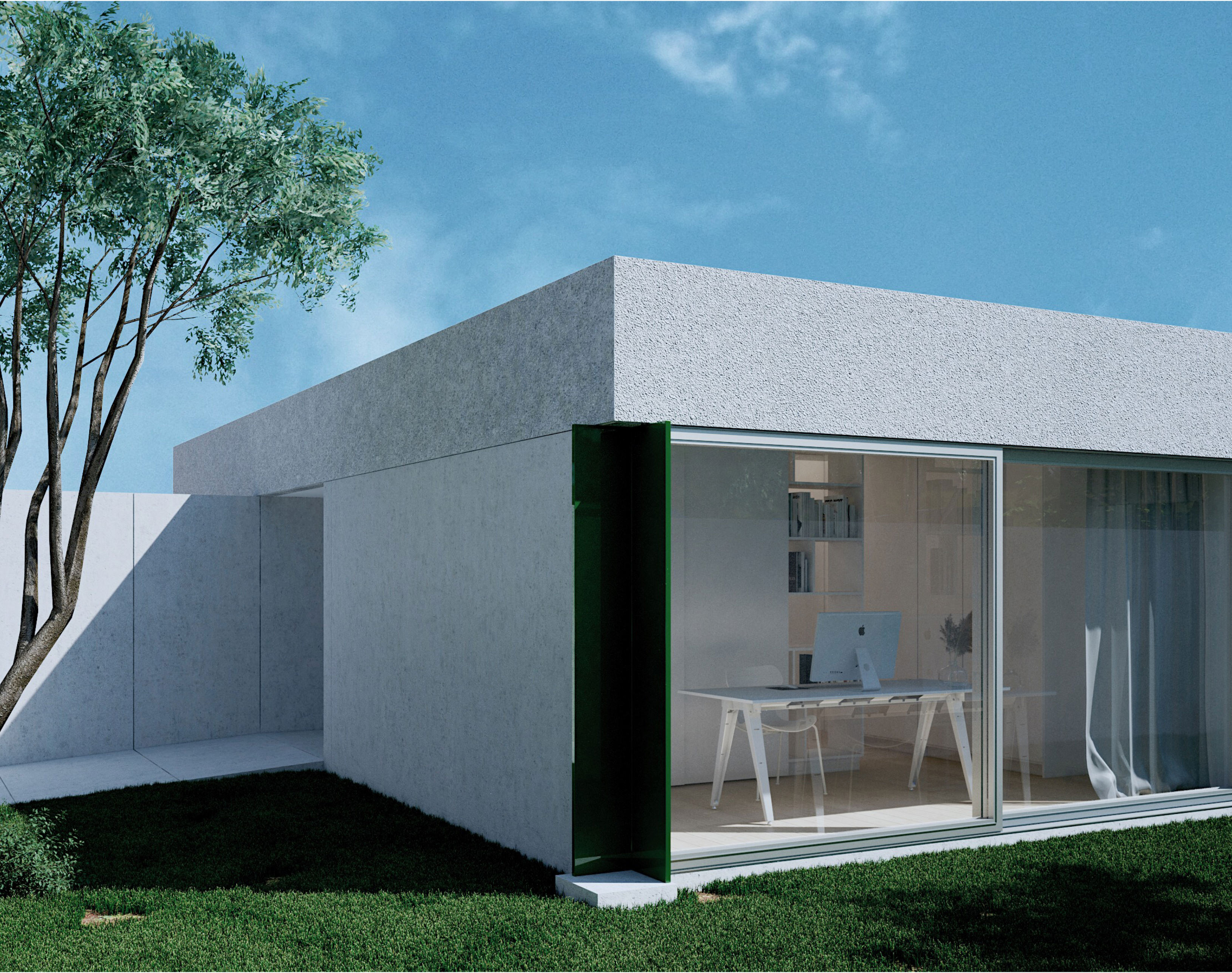 Complying with the legal distances around the perimeter of the plot, we propose a regular geometry coming out a wall that thouch the street and distinguishes the entrance of cars from people. Understanding neighboring noise buildings over the street, we proposed a very mimetic street front and, besides, a very concrete modular axes which defines spaces and facades. Above rigorous composition, we introduced two pillars to compose the corners of the geometry and abstract, in a way, the facades.