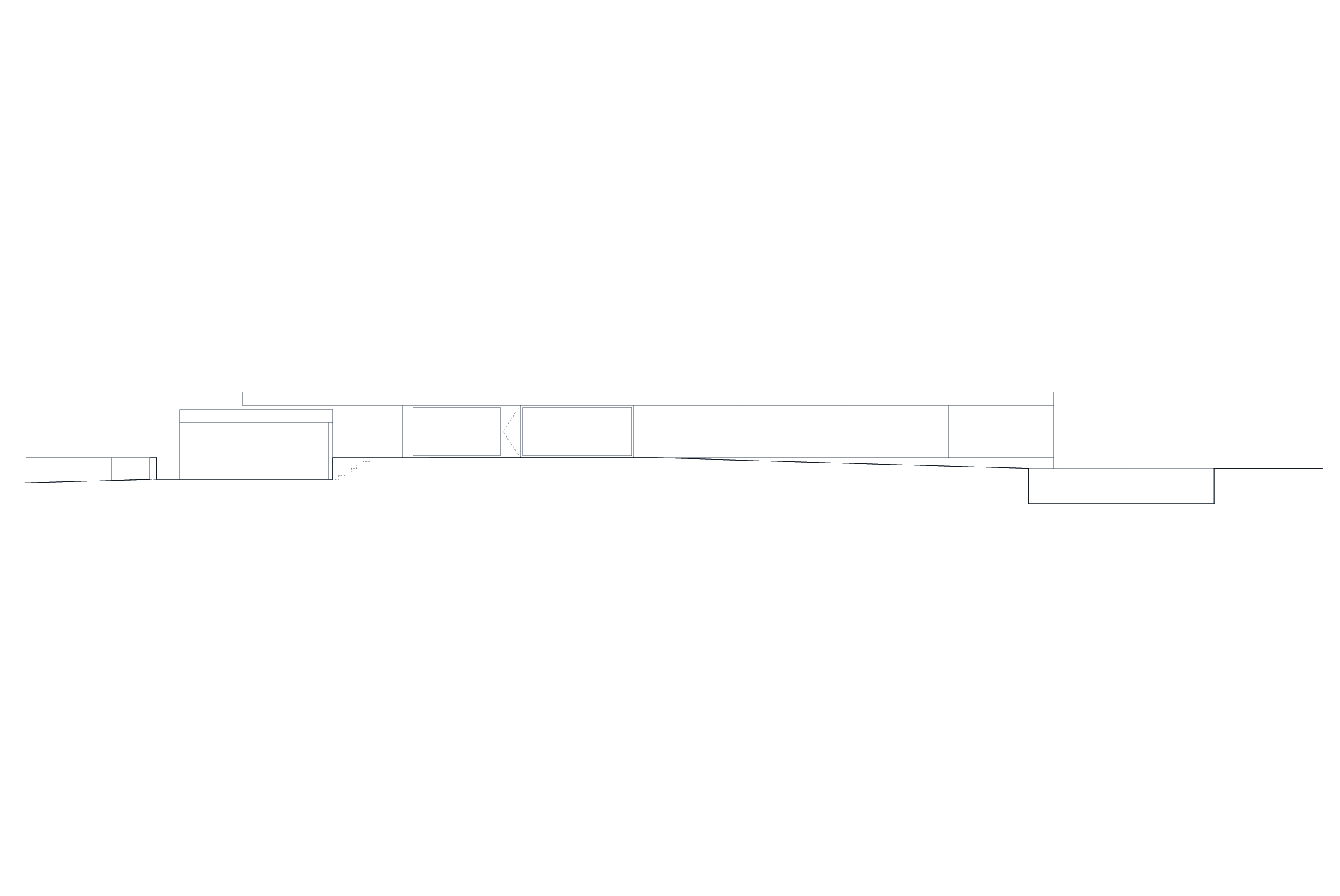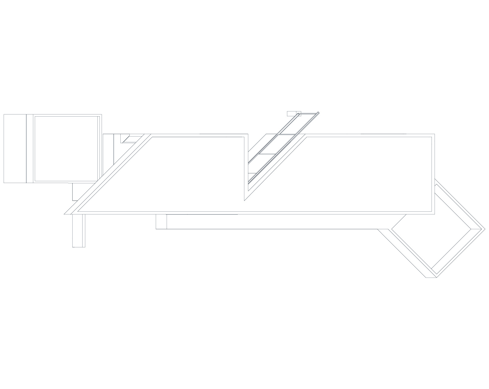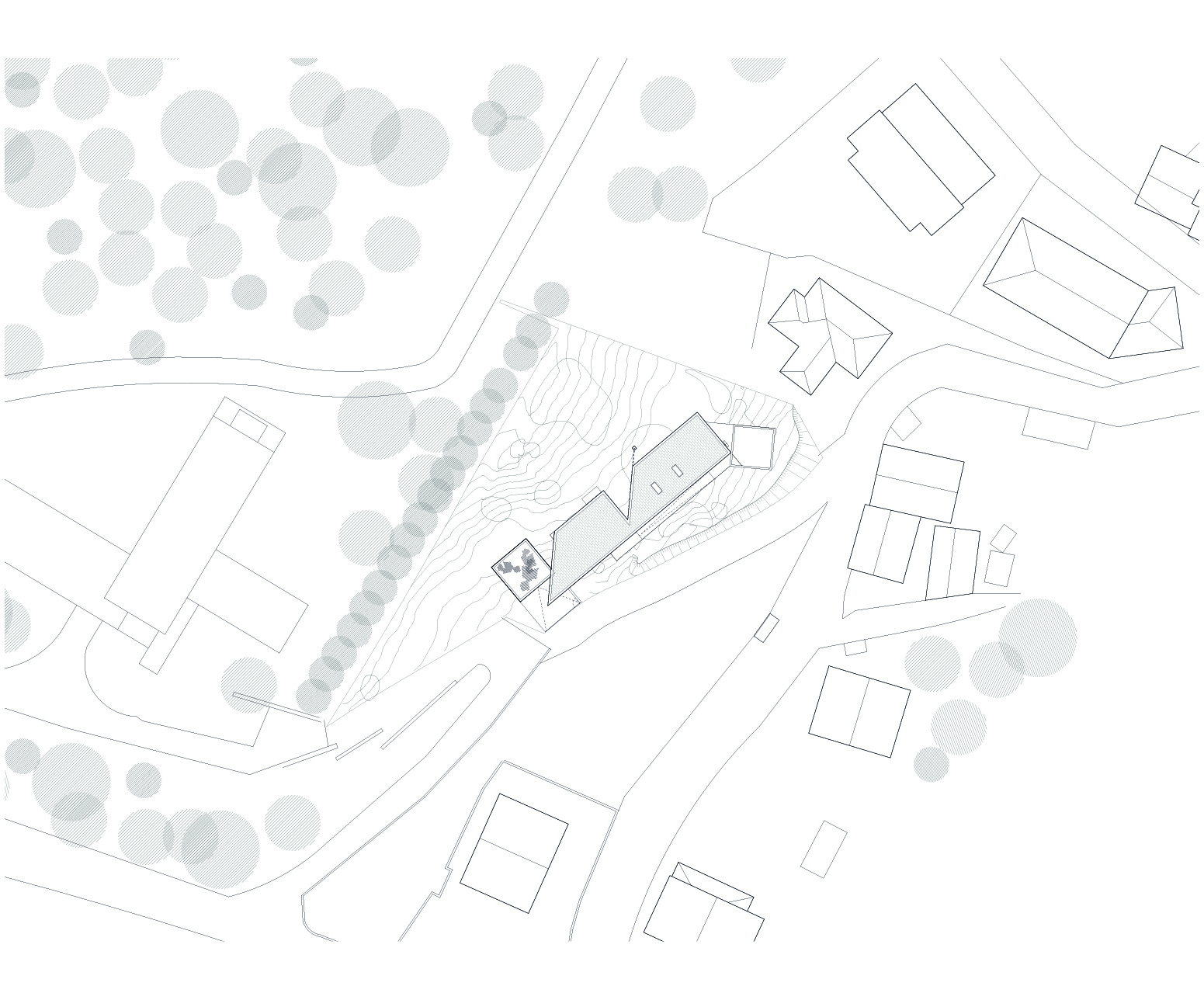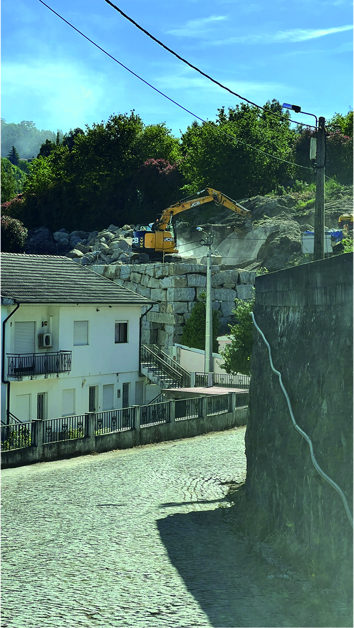 The construction site had a lot of municipal constraints besides an 8m differential from the high to the low level and being a highly rocky ground. The most structural design constraint was the definition of a different percentage of construction for each half of the land. The shape and position of the volume, for the minimum intended construction area, it was just an arithmetic game. The building base that touches the ground was the one that had to fit the percentages and, at some point, it was necessary to reduce the area. The module that divided the social area from the private area of the house seemed to be the right module to remove half of it, diagonally. Therefore, a 45º angle was defined which became the rule, whether for positioning the pool or defining the roof geometry that makes the connecting between the garage into the house.