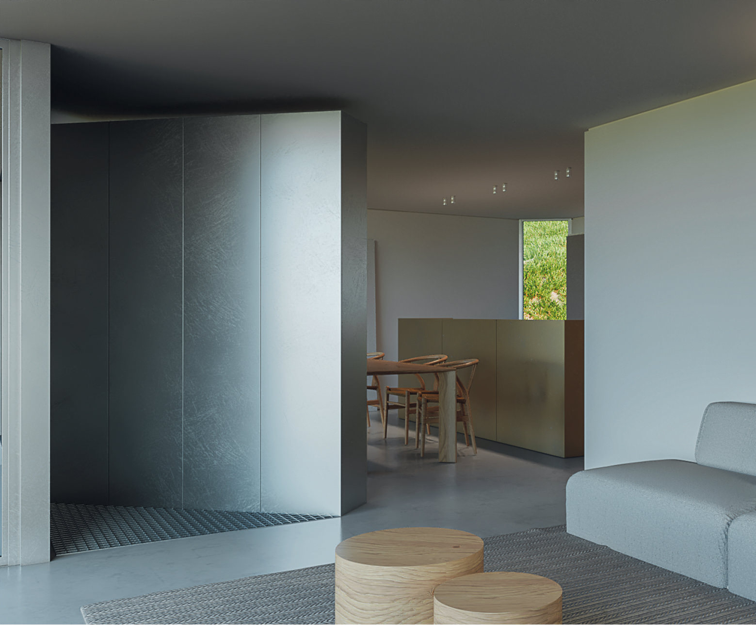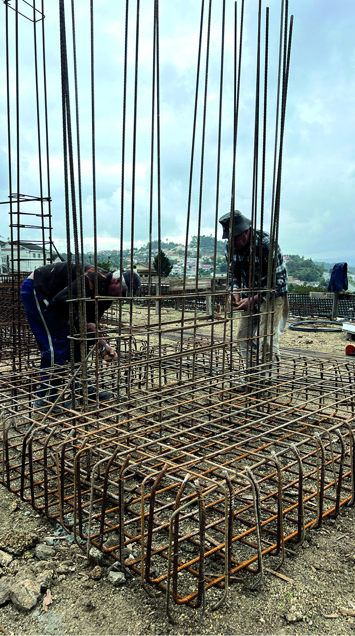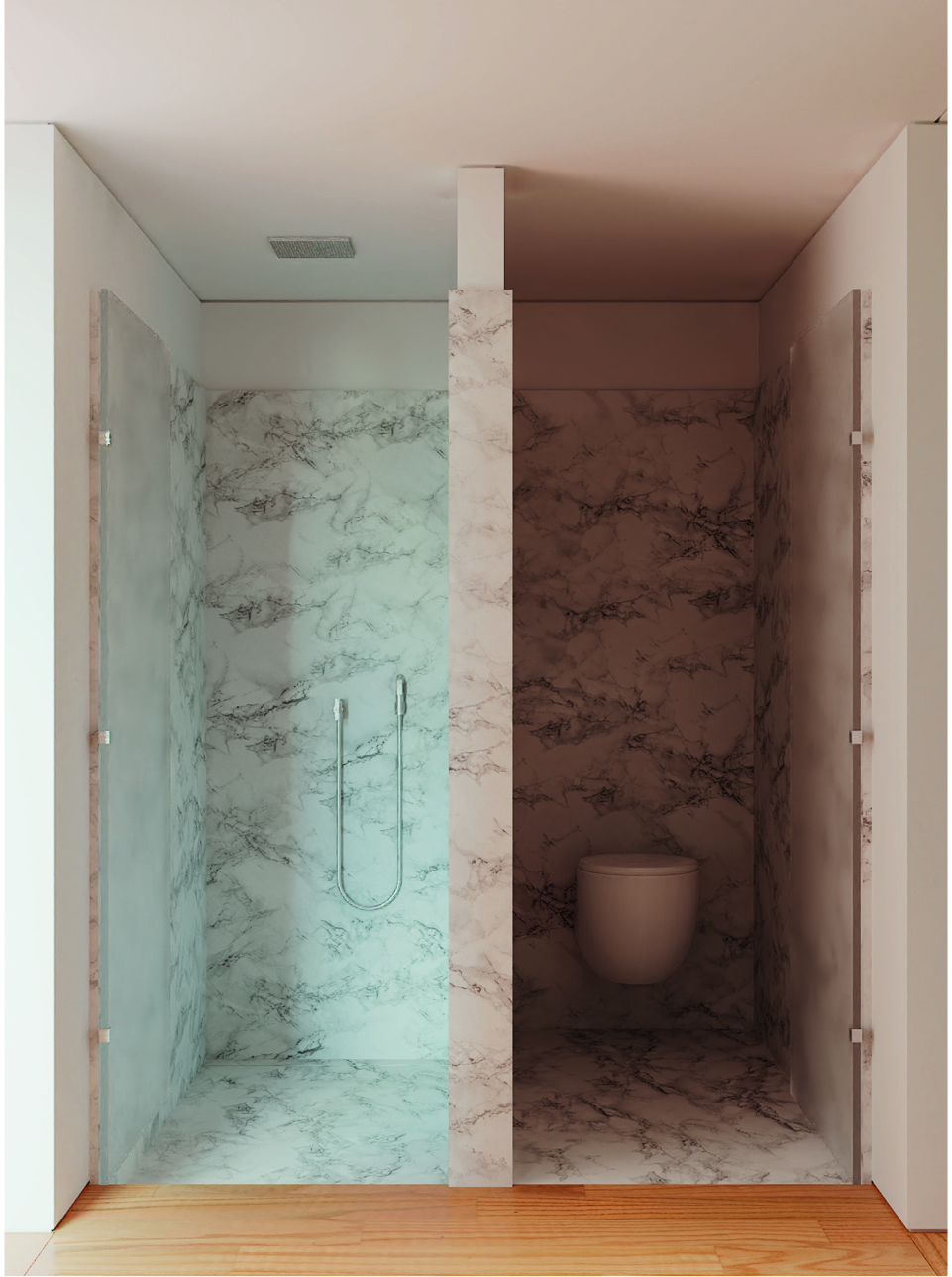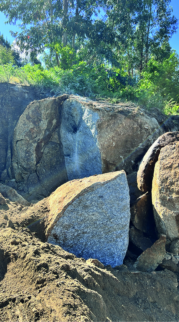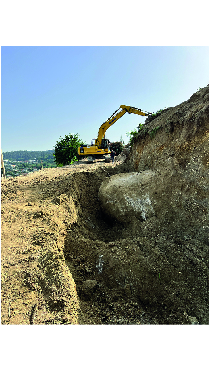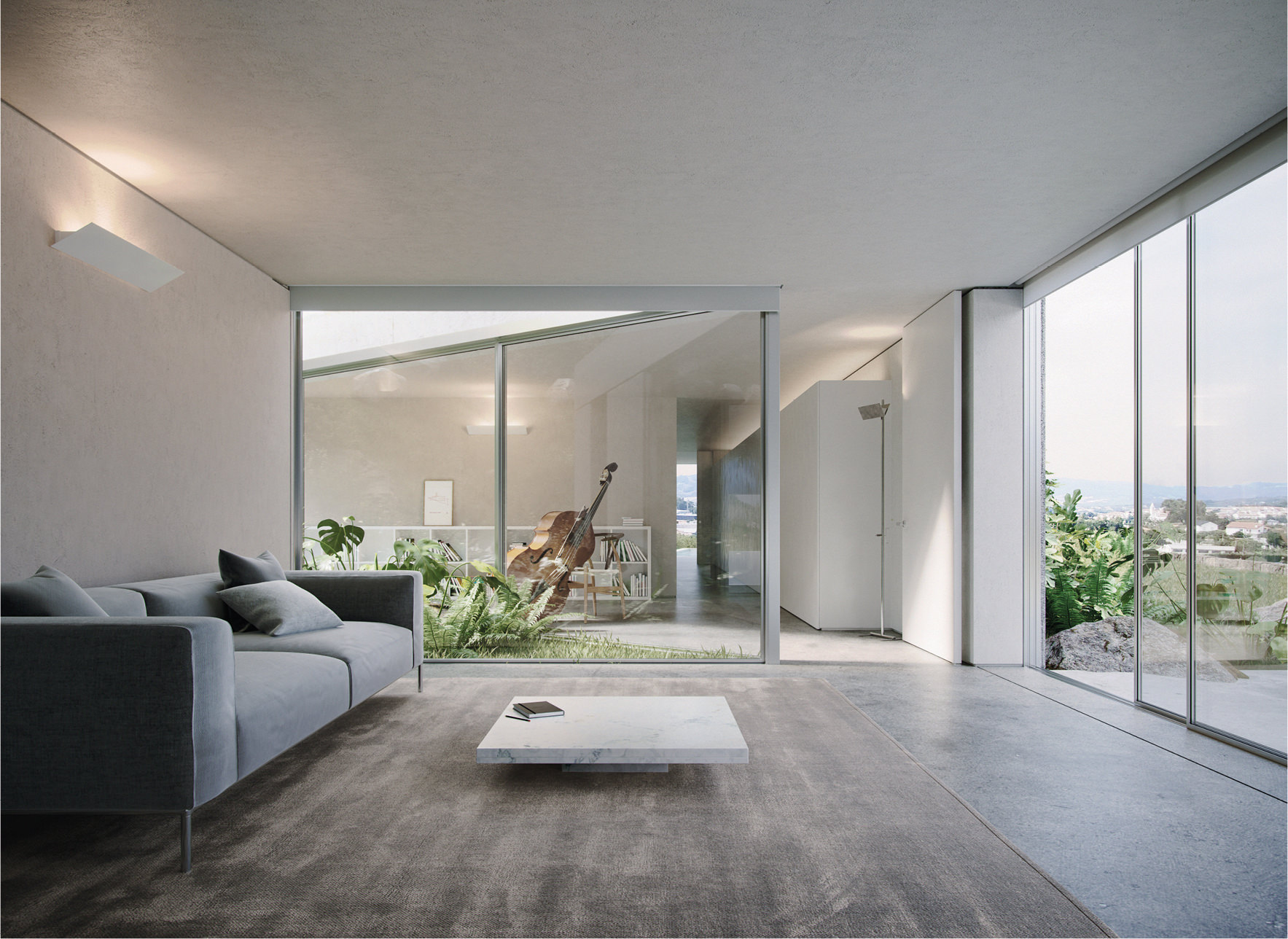 The construction site had a lot of municipal constraints besides an 8m differential from the high to the low level and being a highly rocky ground. The most structural design constraint was the definition of a different percentage of construction for each half of the land. The shape and position of the volume, for the minimum intended construction area, it was just an arithmetic game. The building base that touches the ground was the one that had to fit the percentages and, at some point, it was necessary to reduce the area. The module that divided the social area from the private area of the house seemed to be the right module to remove half of it, diagonally. Therefore, a 45º angle was defined which became the rule, whether for positioning the pool or defining the roof geometry that makes the connecting between the garage into the house.