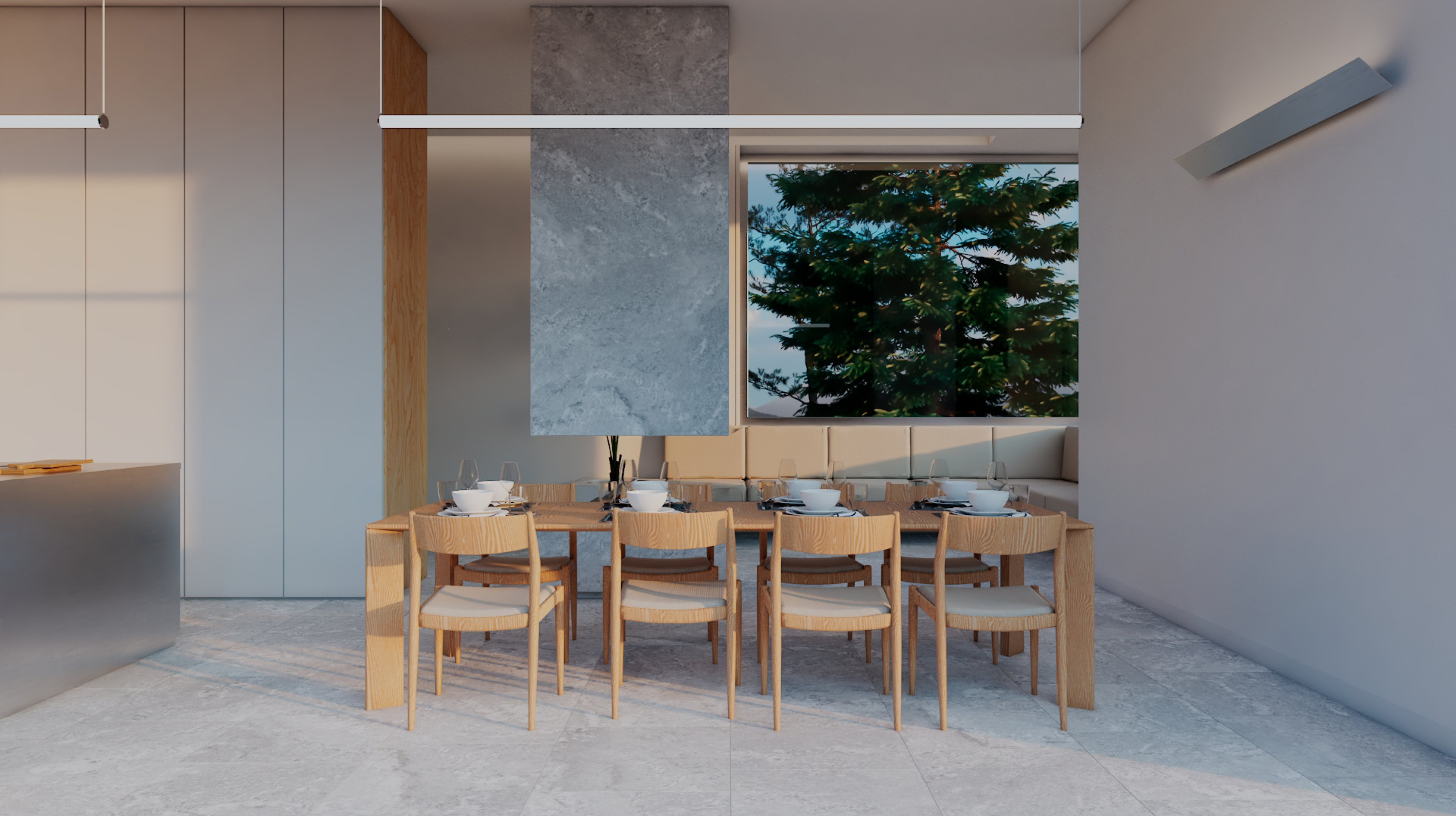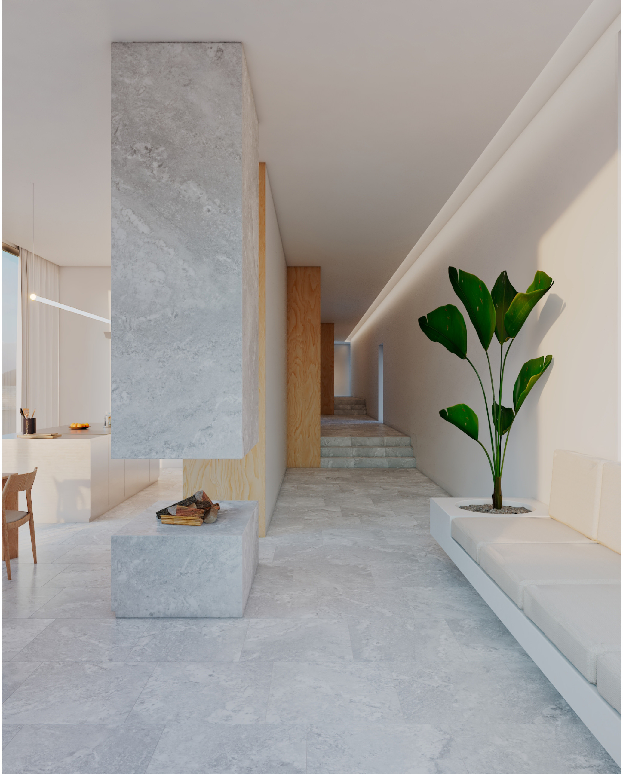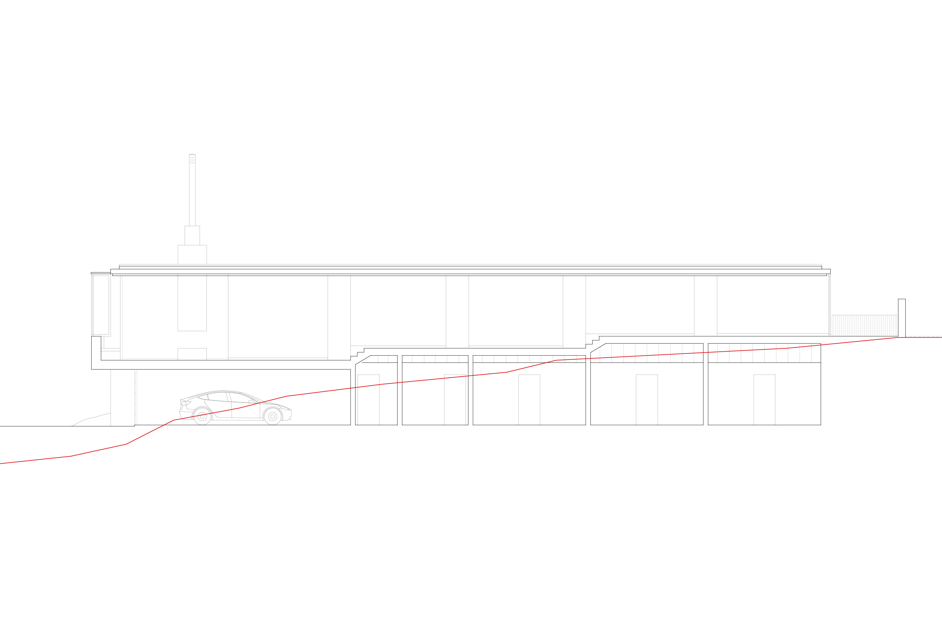 We knew that the typology would be linear and due to the proximity of the neighbor to the South, we blinded this facade. To the North, the facade opens up to it's full length over 2300sqm terrain where nothing could be built. A internal corridor starts to be defined as a longitudinal link over the total extension of the house and we felt it was important to work on this "unloved typology piece". More than an access, we started to deconstruct the corridor in it's width and height, following the natural unevenness of the terrain; plus the natural internal program sequence.