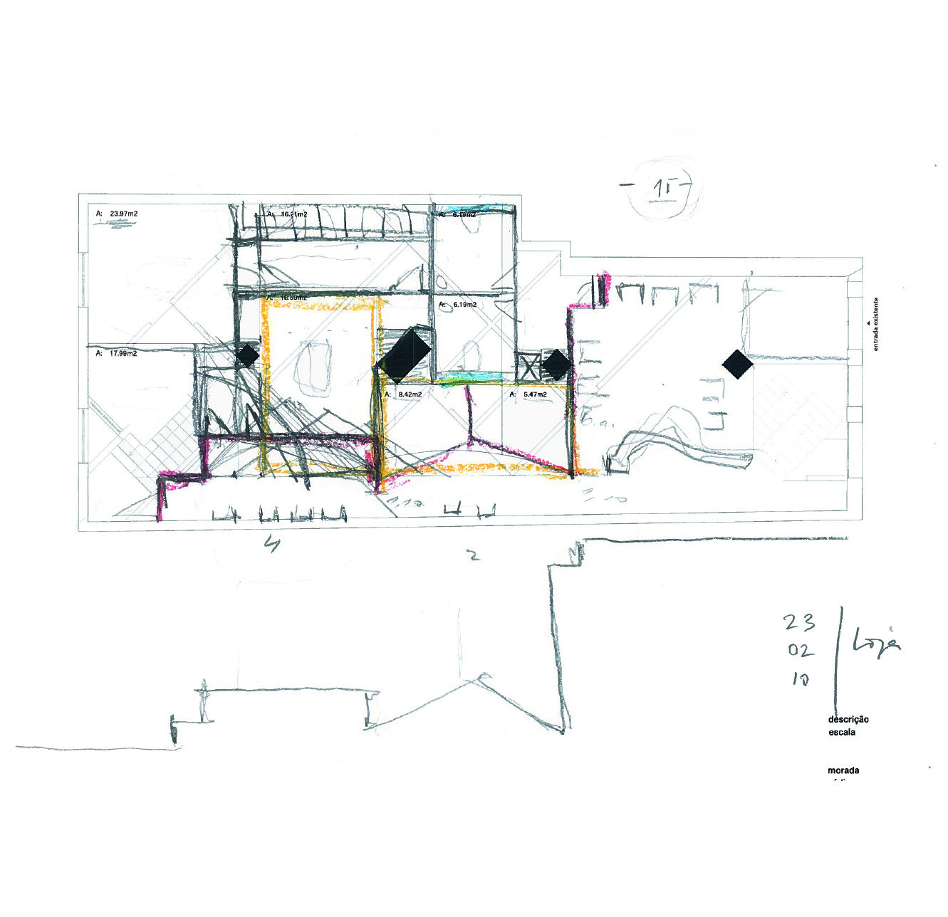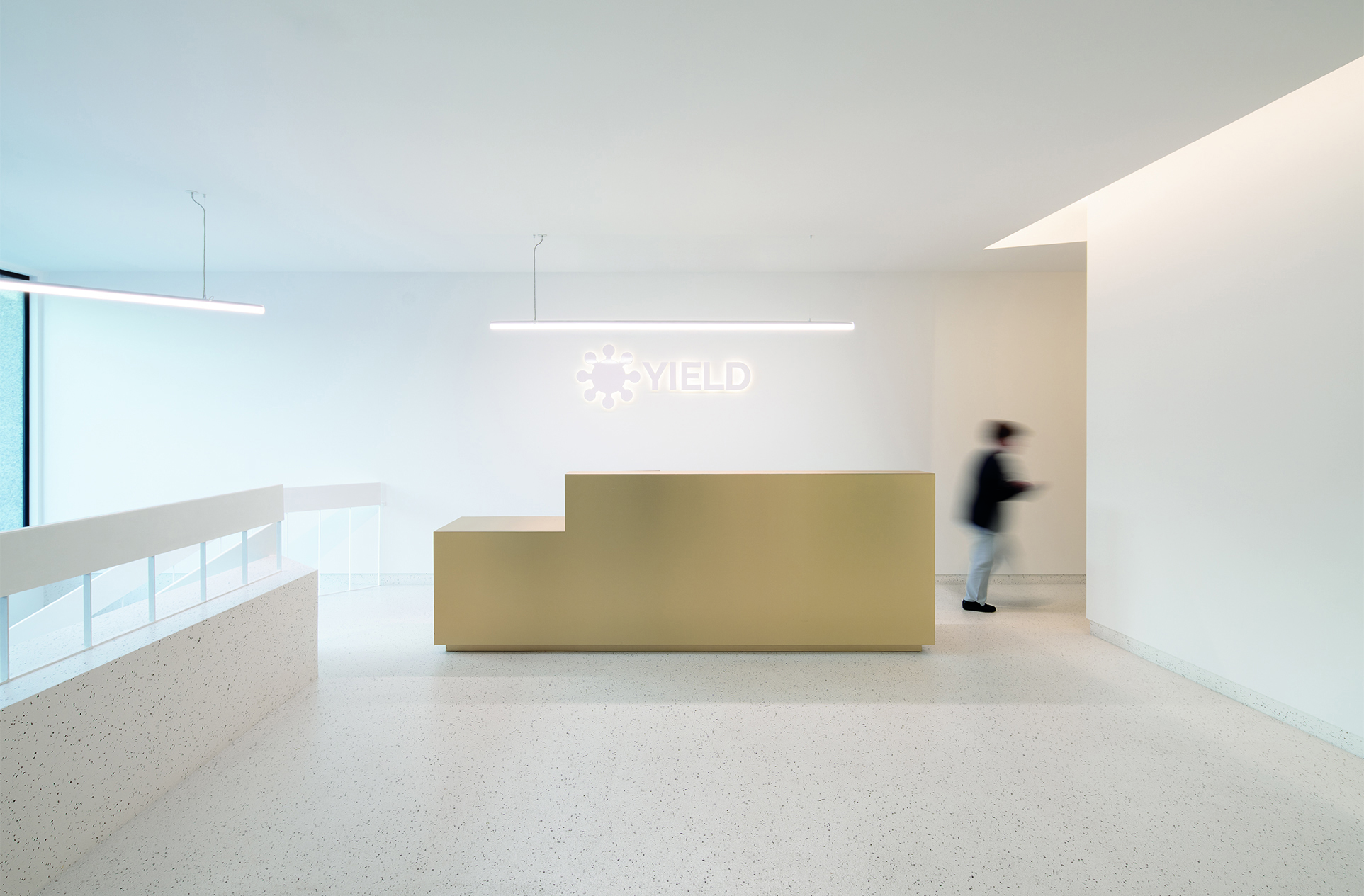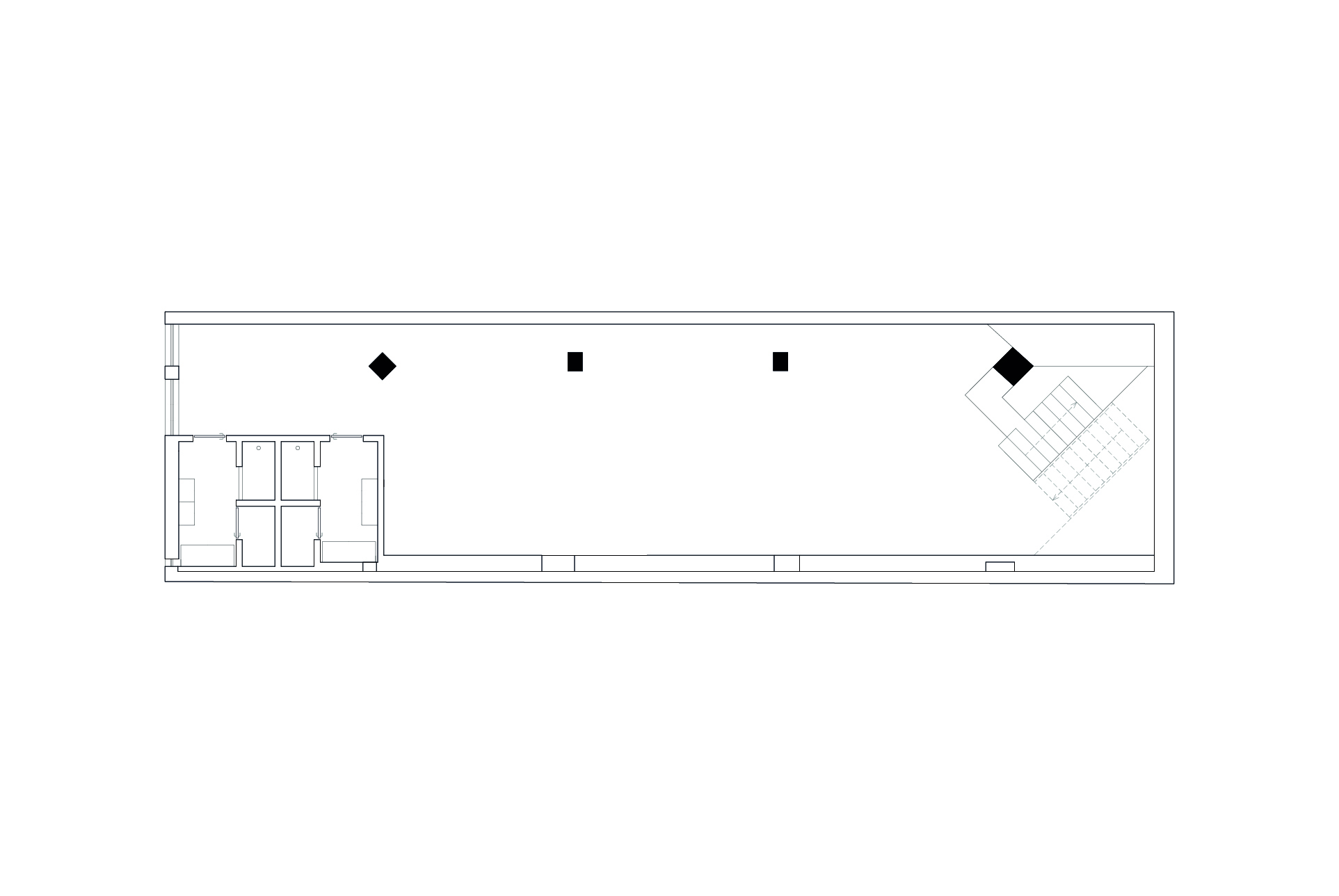 The project is located in a former bank, whose original layout was structured according to an arrangement of diagonals. This geometry defined the placement of large pillars throughout the space, which heavily influenced the design approach. The lab and medical clinic project was based on this orientation and scale. Through the construction process, we discovered the true shape of the pillars, which are orthogonal and half the expected dimension.