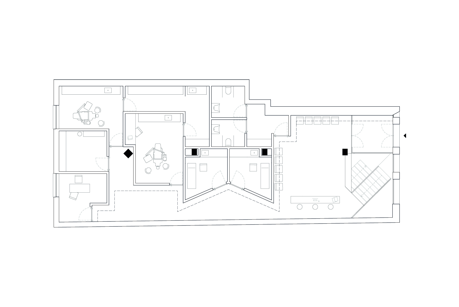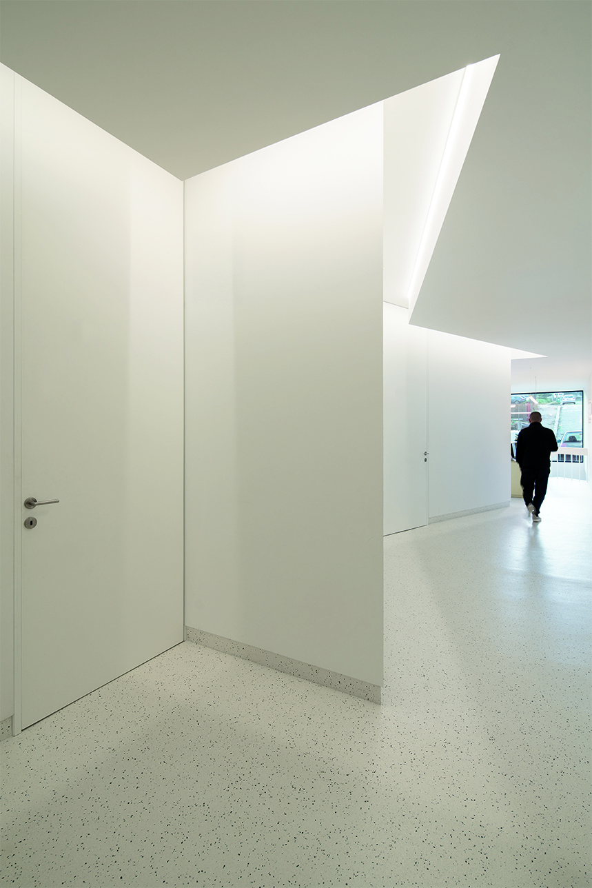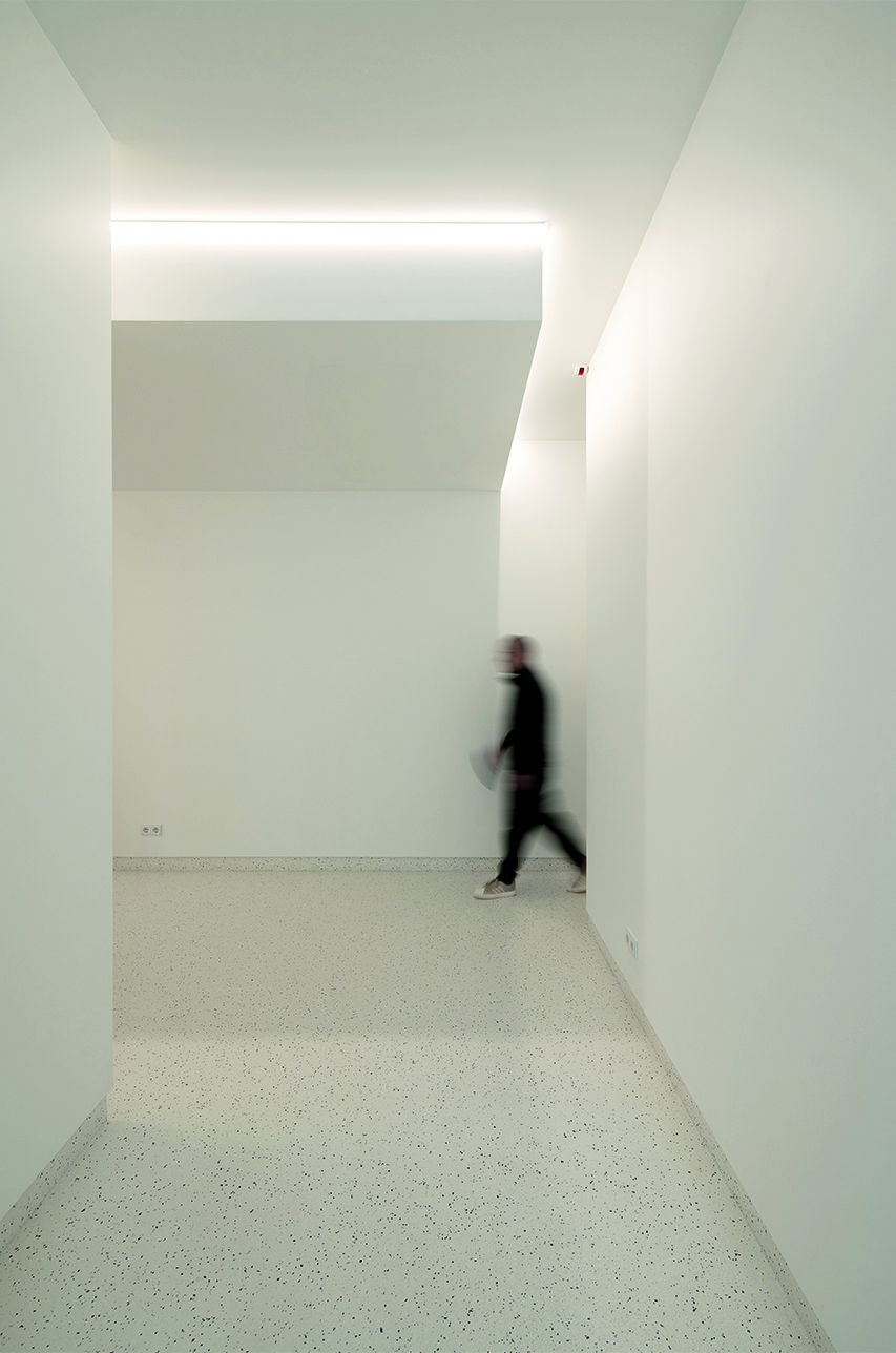 The layout of the working spaces adapted to these circumstances, especially by expanding in square meters to accommodate the necessary number of medical offices. The typology was organised into three types of spaces: public (reception), semi-public (corridor/waiting area for the offices), and private (basement).