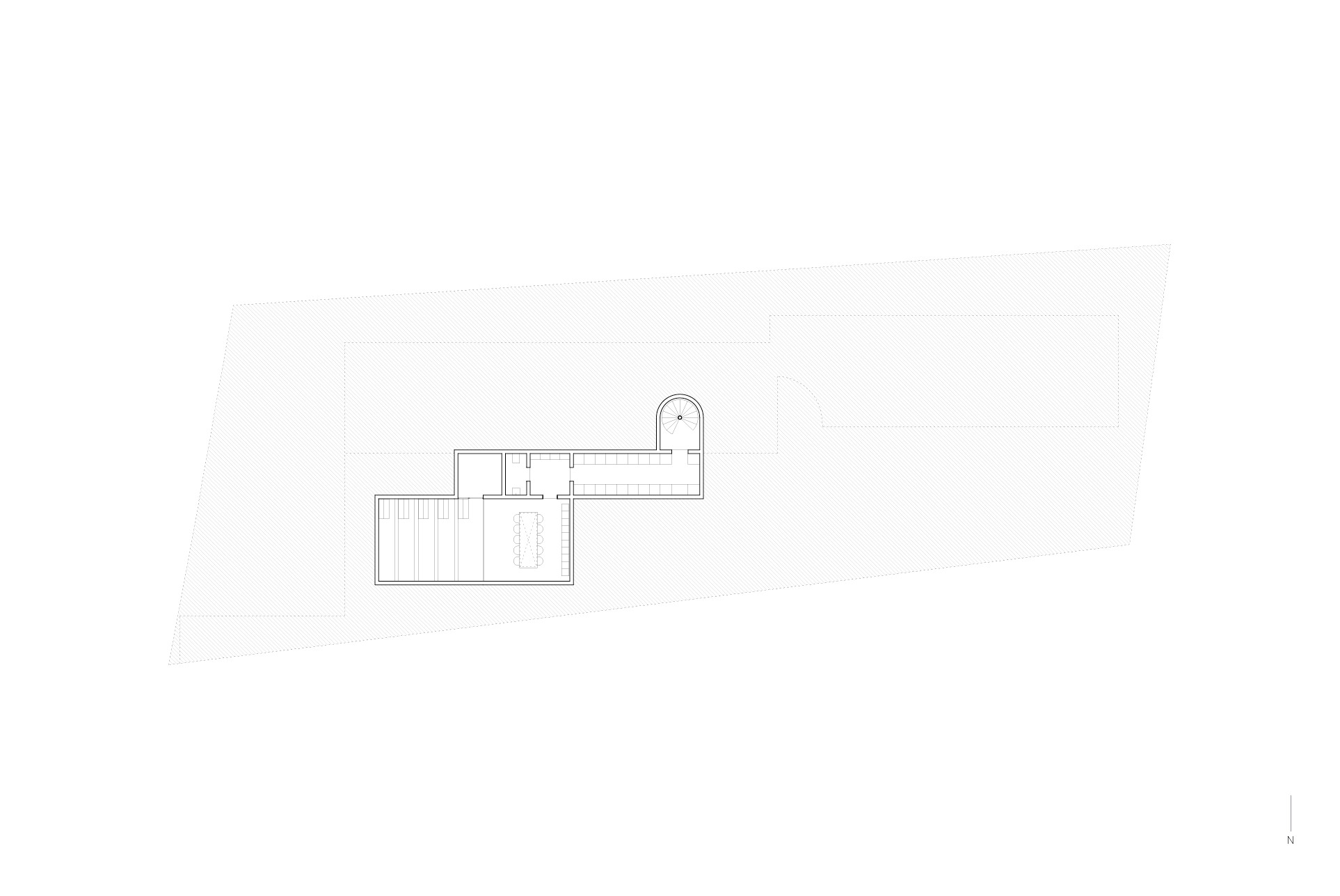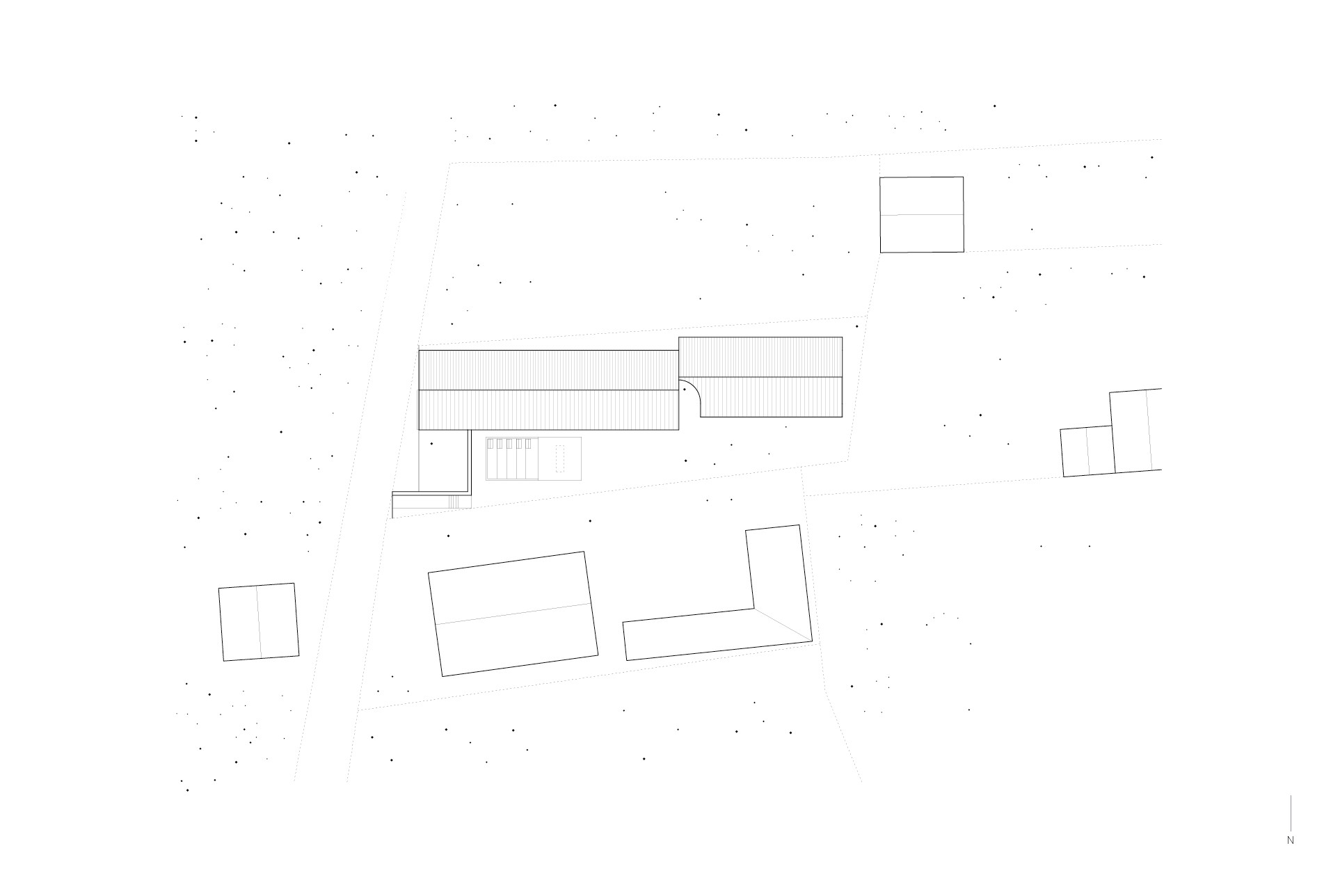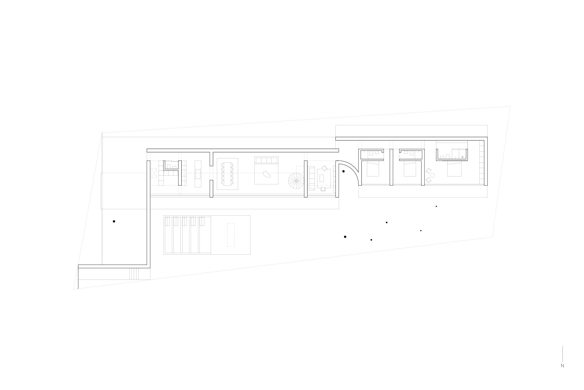 The project is defined by a continuous wall - as a line - that establishes a typology hierarchy (social to private areas) and a sequence of programatic spaces waging dynamic flows inside and outside. The wall was adjusted respecting the classified trees promoting wholesome architectural grammar.